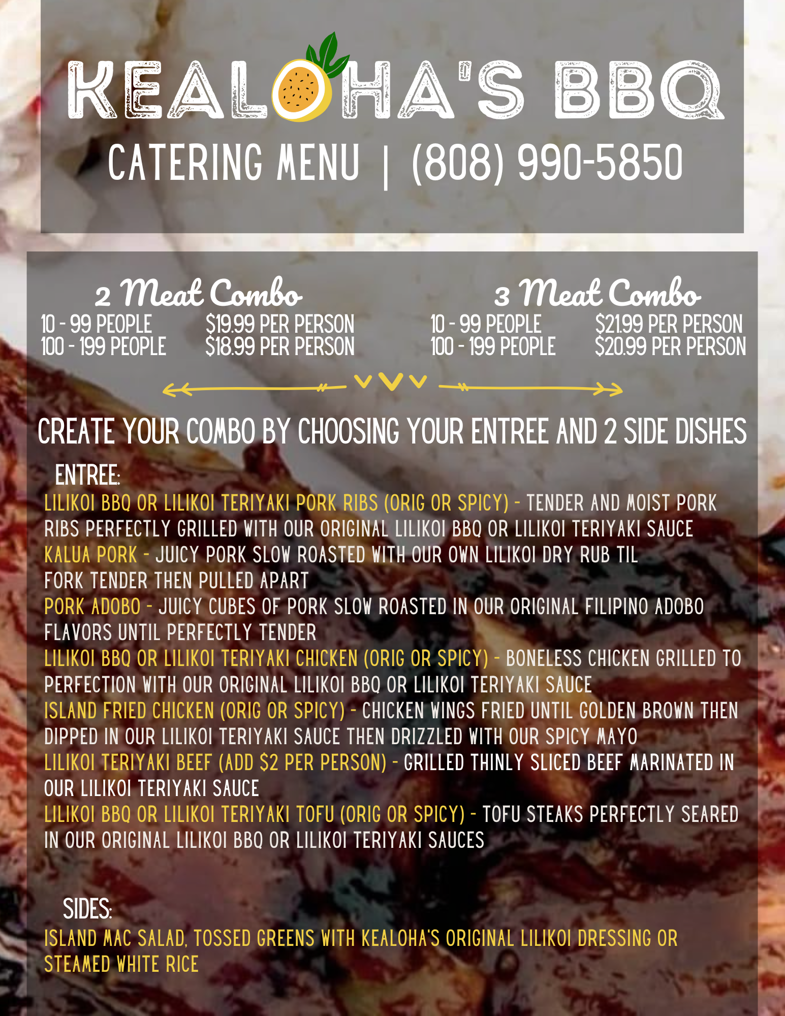 For catering orders, please text (808) 990-5850 with your event's date, time, location, number of guests, and menu choices (refer to the menu below). Orders should be texted at least two days prior to the event. Delivery is complimentary within 9 miles; however, there is a $25 charge for distances of 10 miles or more. Mahalo nui loa! We look forward to serving you soon =)